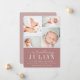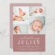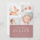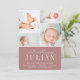 Les annonces de naissance élégantes comportent quatre photos de nouveau-nés disposées dans une grille de montage sur un arrière - plan mauve rose poussiéreux. "Introduce [name]" apparaît sous le script de calligraphie chic et le lettrage de bloc classique. Personnalisez avec le nom complet du bébé, les statistiques de naissance et une signature de famille en bas.