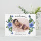 Joli et élégant baby shower photo floral avec un cadre ovale orné d'illustrations d'aquarelle de fleurs bleues et de feuilles verts, le texte "Welcome" en écriture manuscrite libre, un espace réservé pour une photo horizontale, et des champs de texte modifiables pour vos détails dans une police serif sophistiquée. Les cartes sont retournées à un motif en diagonale de boutons de fleurs bleus et de feuilles verts. Personnalisez facilement cette conception pour correspondre à votre style en cliquant sur "Personnaliser" pour aller à l'outil de conception et ajouter votre propre texte ou détails personnalisés.