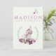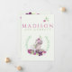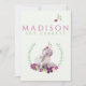 Notre jolie carte faire-part de naissance photo présente votre belle petite fille avec son nom sur le devant avec des flores roses et violettes et un hippo mignon avec un radis. Customisez le dos avec une photo de nouveau-né et un texte de script pour présenter les informations importantes sur la naissance de votre bébé, ainsi que les noms des parents. La photo est encadrée par un cadre mauve pastel et doux, surmonté de fleurs violettes et roses.