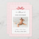 Une charmante carte en vichy rose et blanc présente un arc rouge doux attaché au sommet, ajoutant une touche d'élégance. Les couleurs douces et pastel créent une atmosphère douce et féminine, parfaite pour accueillir une petite fille. La en vichy motif ajoute une touche ludique et classique, rendant cette carte à la fois adorable et intemporelle.