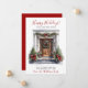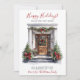 Cette aquarelle Happy Holidays nouvelle maison pour les vacances carte de faire-part avec une porte d'entrée en bois décorée de façon festive avec une pinède, des arbres, une couronne et des arcs de vacances rouges serait parfait pour envoyer à vos amis et votre famille maintenant que vous avez déménagé dans une nouvelle maison. Le sentiment est personnalisable. Obtenez assez pour que tous ceux que vous connaissez et aimez aient votre nouvelle adresse. Ils seront tellement excités par votre grand mouvement !