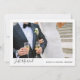 Ce simple et moderne Just Married 2 Photo Elopement Sedding Faire-part est le moyen idéal pour faire connaître à vos amis et votre famille votre évènement, cérémonie secrète ou mariage privé! Une simple bordure blanche encadre votre magnifique photo mariage horizontale, avec "juste marié" en bas à gauche dans une belle typographie de script à la main bondissante, et vos noms à droite dans une magnifique police sans serif. Le dos de la carte est également blanc, et dispose d'une ouverture verticale à droite pour votre photo de mariage vertical, un message personnel à gauche, et un lien de code QR vers votre site Web. Copyright Anastasia Surridge pour Anastasia Designs, tous droits réservés.