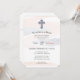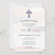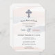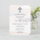 Des aquarelles roses et bleues subtiles tourbillonnent sur le faire-part. Embellie d'une croix à motif.