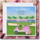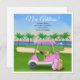 This elegant pink glitter golf cart sits on a sunny coastal course with palm trees swaying in the breeze, loaded high with moving boxes. A fun and stylish way to share your move, this cheerful design is sure to bring a smile to friends, family, and fellow golf lovers when they receive your postcard.