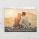 Cette carte à plat romantique personnalisée de report de mariage comprend un modèle de design de typographie avec votre photo sur le devant et les mots "L'amour est patient" en script blanc romantique avec vos noms et mariage reporté faire-part à personnaliser. Le dos de la carte a une photo avec une superposition et un message et une signature pour customiser. Meilleurs voeux pour votre futur mariage ! Conçu par Susan Coffey.