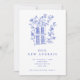 Une nouvelle adresse de charme/nouvelle faire-part avec une ligne bleue dessinée illustration d'une maison entourée de fleurs à la traîne.