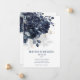 Un bouquet floral bleu marine moderne et élégant avec son ombre doucement débordant sur l'invitation et éclaboussant d'or éclaboussant et des éléments, avec vos prénoms dans une police moderne avec une date mariage numérique en dessous et une petite police pour les détails.