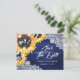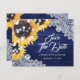 Mariage de tournesol bleu marine personnalisé enregistrer les cartes datant des tournesols contre un arrière - plan en bois rustique orné de lumières scintillantes et à cordes. Notre mariage rustique bleu marine à l'exception de la carte de date est parfait pour un pays rustique, jardin, ou fête de mariage de grange inspiré des tournesols.