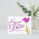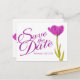Belle tulipe violet simple brillant sur un arrière - plan blanc enregistrer la date mariage invitation informelle. Customisez cette invitation avec vos propres mots. Invitation moderne et romantique, idéal pour un mariage de fleurs violet, printanière ou tulipe. Design et art de l'aquarelle tulipe peinture par Sarah Trett.