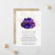 Invitation de mariage florale bleu royal, violet et pourpre avec des accents dorés personnalisables selon les spécificités de votre événement. En ces temps incertains, il peut arriver que vous deviez organiser un mariage plus intime que prévu initialement. Cette carte d'annonce enlèvera la gêne et vous ôtera un poids de l'esprit ! Vous pouvez en outre offrir la possibilité de se joindre à vous pour une cérémonie virtuelle.