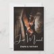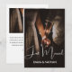 Moderne et élégant modèle de faire-part de mariage carte avec une typographie manuscrite blanche en surimpression avec des volutes qui dit "Just Married" avec vos noms. Personnalisez ce produit en ajoutant deux photos. L'une des photos ira au dos de la carte avec votre message de mariage et de remerciement.