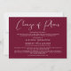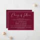 Si des circonstances telles que les directives de distanciation sociale vous obligent à réduire le nombre de participants à votre mariage, vous pouvez informer votre famille et vos amis sur votre liste de invités étendue originale avec cette annonce de mariage réduite, moderne et minimaliste, mais élégante, de couleur bordeaux. "Changement de plans" est écrit dans un joli script blanc et vous pouvez facilement personnaliser le message de réduction de mariage avec plus de détails et ajouter des informations sur la diffusion en direct de la cérémonie, les célébrations futures et le site web du mariage.