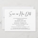 Un mariage moderne minimaliste et simple reporte le faire-part noir et blanc. "Save our New Date" est écrit dans un script élégant et vous pouvez facilement personnaliser avec les détails du report mariage.