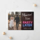 Faire-part de mariage intimiste ou d'élopement moderne pour informer la famille et les amis que des circonstances imprévues ont modifié vos plans de mariage, vous obligeant à vous enfuir ou à réduire le nombre d'invités à votre mariage, mais que vous organiserez une fête de célébration à l'avenir. Le recto présente votre photo d'un côté et "Mariés maintenant" en écriture blanche et "Fête plus tard" en typographie rouge et bleue avec un effet de néon lumineux sur fond de mur de briques. Au verso, vous pouvez personnaliser votre message de manière plus détaillée et vos noms dans une écriture ressemblant à une signature.