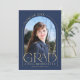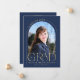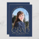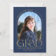 Cette faire-part de graduation minimaliste marine bleu et or simple arche dispose d'un cadre arche délicat, 2 modèles photo et élégante typographie moderne.