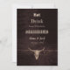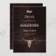 Texture marron rustique imprimée crâne de taureau. Conception de bois de plaisir marié de boisson de pays de l'ouest de campagne. Cartes plates d'annonce de mariage uniques. Utilisez un peu d'humour avec ces invitations mignonnes et drôles de style de ferme. Manger, boire, parce que nous nous marions peut être personnalisé. Tendance, ancien style vintage sauvage ouest antique inspiré. Animal de ferme cool. Personnalisez le script et la typographie. Image copyright Marg Seregelyi Photographie.
