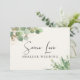 Si les circonstances vous obligent à réduire la taille et le nombre d'invités à votre mariage, vous pouvez informer votre liste de invités élargie originale avec cette belle et moderne carte d'annonce de mariage réduite de couleur crème clair avec des aquarelles douces de feuilles d'eucalyptus vert clair avec des accents dorés et "Same Love Smaller Wedding" écrit dans un script élégant et une typographie moderne sur le devant crème clair. Au dos de couleur vert sauge clair, vous pouvez facilement personnaliser le message de réduction de mariage avec plus de détails et ajouter toute diffusion en direct de la cérémonie, les futures célébrations et les informations sur le site web du mariage.
