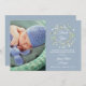 Un carte de remerciements de guirlandes verdoyantes en laurier décoratif avec une photo de votre arrivée spéciale. Personnalisez le message de remerciement et ajoutez votre nom et vos statistiques de naissance sur un arrière - plan bleu poussiéreux. Conçu par Thisisnotme©