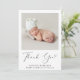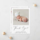 Faire-part de naissance et carte de remerciements minimal pour bébé ou fille avec photo et "Merci" de votre nouveau-né dans un script élégant avec un swash de coeur. Personnalisez avec son nom, la date d'arrivée et les statistiques de naissance dans la typographie moderne simple. Au verso, ajoutez une photo supplémentaire et votre faire-part customisé et un message de remerciement.