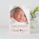 Une jolie petite fille rose merci faire-part de naissance. Le devant présente sa photo, son nom, sa date d'arrivée et ses statistiques de naissance, et "merci" écrit dans un texte gris mou avec un coeur joignant les deux mots. À l'envers, ajoutez une photo supplémentaire, personnalisez un message de remerciement et ajoutez des noms de parents et de frères et soeurs dans la typographie grise sous une flèche coordonnant mignon avec un coeur.