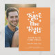 Modern Retro Typography over a soft orange background and a Photo Wedding Announcement Flat Card. With a unique typography "save the date" on the front, with names and date in a simple and minimal design on the back, add your wedding website for event details. The couples photo is a full-frame photo. A unique and affordable Wedding Save the Date for couples on a budget. Choose prints and/or a digital announcement download.