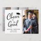Carte moderne 2 photo graduation faire-part. Sur le devant, la photo de votre diplômé est à côté de "Cheers to the Grad" écrit dans un script moderne avec un grand casquette sur le dessus. Vous pouvez facilement personnaliser avec le nom et l'école de votre diplômé, et ajouter une autre photo au dos.