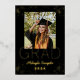 Design moderne élégant en noir et or. Ajoutez votre photo spéciale ! Le nom et l'année du diplômé sont ci-dessous. Le texte et les spécifications d'or en haut et en bas de la carte sont en feuille d'or. L'arrière dispose d'une autre photo et d'un message personnalisé à partager avec votre famille et vos amis. L'année est personnalisable et peut être changée. Il y a un choix de feuilles de couleurs différentes.