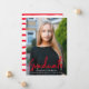 Faire-part de graduation moderne et élégant avec la photo verticale du diplômé avec "Graduate" dans une police de caractères de pinceau rouge. Personnalisez le faire-part de remise de diplômes photo en ajoutant le nom du diplômé, le nom de l'école et l'année de remise de diplômes. La faire-part tendance de graduation s'inverse pour afficher un motif rayé rouge et blanc.