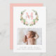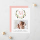 Un joli design pour annoncer l'arrivée de votre petite fille. Le dessus est orné d'une couronne de fer à cheval d'aquarelle de roses rose et blanc avec des feuilles verts, avec l'initiale de votre fille en rose, surplombée de son nom en gris. Montrez votre ange avec une photo au centre. Les détails de la naissance et l'approbation est en bas en gris foncé. L'inverse est en rose massif.