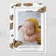 Célébrez et annoncez vos plus grandes nouvelles avec ces belles cartes papillon! Partagez vos bonnes nouvelles avec votre famille et vos amis et montrez votre style! La carte présente des oeuvres d'art d'un papillon Monarque flottant amoureusement autour d'une photo portrait de votre nouveau bébé doux! Avec une bordure en noir et texte classique, ces cartes intemporelles sont élégantes et contemporaines. La superposition de texte dit : "Rencontrez (nom du bébé)" suivi d'un espace pour customiser avec les statistiques de naissance de votre bébé, ou toute information que vous voudriez. Backside propose une photo de portrait supplémentaire, parce que qui peut choisir une seule photo de son adorable et précieux bébé ? L'art papillon de l'avant est modelé sur l'arrière pour un thème cohésif.
