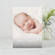Un faire-part de naissance photo à budget doux avec un nom moderne et une photo de portrait vertical à fond saigné. Le dos a 2 photos supplémentaires taches un grand en-tête de nom complet et message personnel de la famille.