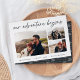 Une carte de faire-part fiançailles moderne et passionnante pour le couple aventurier, cette conception simple et épurée comprend trois photos horizontales ou orientées paysage dans une mise en page de collage grille, avec "notre aventure commence" ci-dessus en écriture manuscrite. Personnalisez avec vos faire-part, noms et détails supplémentaires le long du bas.