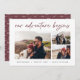 Une carte de faire-part fiançailles moderne et passionnante pour le couple aventurier, cette conception simple et épurée comprend trois photos horizontales ou orientées paysage dans une mise en page de collage grille, avec "notre aventure commence" ci-dessus en écriture manuscrite. Personnalisez avec vos faire-part, noms et détails supplémentaires le long du bas.