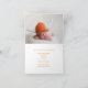 Cette jolie carte pliée de photo de nouveau-né de Thanksgiving moderne et élégante présente une photographie de votre doux nouveau bébé sous les mots Notre petit citrouille en orange. Cette belle photographie automnale avec un bois blanc tendance derrière le champ de citrouilles est une carte d'annonce de naissance élégante pour Halloween ou Thanksgiving.