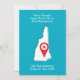 Faites savoir à vos proches votre grand déménagement avec cette carte "Nous avons déménagé ! Venez nous rendre visite dans le New Hampshire" ! Elle présente une carte stylée de votre nouvel État avec un marqueur de carte mobile pointant vers votre nouvelle adresse. Cette carte rend le partage de votre nouvel emplacement facile et amusant. Le verso comprend un message personnalisé pour la famille et les amis, ainsi qu'une zone de texte personnalisable pour votre nom et votre numéro de téléphone - afin qu'ils sachent toujours comment vous joindre. Que vous les invitiez à vous rendre visite ou que vous restiez simplement en contact, cette carte est le moyen idéal pour partager votre excitante nouvelle !