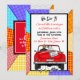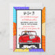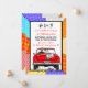 Voiture décapotable vintage rétro pop art avec mariés et panneau "juste mariés" avec des canettes suspendues à l'arrière de leur voiture s'éloignant après la fête invitation.