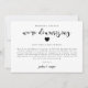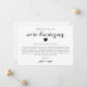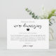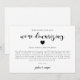 Carte de mise à jour de mariage simple et moderne avec un design noir et blanc et un texte écrit en script qui dit "nous réduisons la taille" avec un cœur. La carte explique que c'était une décision difficile mais nécessaire pour donner la priorité à la santé et au bien-être des invités.