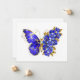 Bijoux, bleu, saphir, papillon aux fleurs pétillantes avec aile décorée de bleu, fleurs précieuses avec feuilles d'or sur arrière - plan blanc.