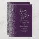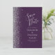 Le bord gauche de cet élégant mariage moderne, à l'exception de la carte de date, comporte une bordure en faux parties scintillant argent. Le texte personnalisable associe écriture gris argenté, copperplate et polices italiques sur un arrière - plan violet foncé. L'envers est assorti d'un design violet et argenté.