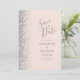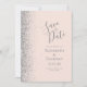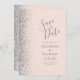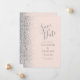 Le bord gauche de cet élégant mariage moderne, à l'exception de la carte de date, comporte une bordure en faux parties scintillant argent. Le texte personnalisable associe écriture grise, copperplate et polices italiques sur un arrière - plan rose vif. L'envers est assorti d'un design blush et argent.