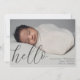 Il s'agit d'un modèle de bébé chic, moderne et simple. À l'avant, vous trouverez de l'espace pour votre photo préférée, avec une élégante couche de calligraphie "hello". Au verso, il y a de la place pour 2 autres photos et un message personnel. Customisez facilement pour ce souvenir unique pour la famille et les amis à apprécier pour les années à venir.