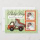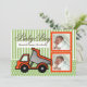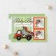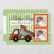 Annonce de naissance de bébé adorable avec des camions à benne basculante, des rayures et des pois en vert et orange pour votre nouveau bébé garçon. Personnalisable avec deux photos. Beaucoup de place pour le texte au dos.