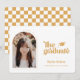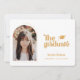 Retro Type Graduation Photo Faire-part. Caractéristiques, photo à cadre simple arc, accent casquette gris, typographie rétro en jaune vintage rustique et dos motif de vérificateur de coordination.