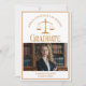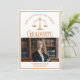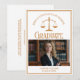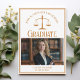 Cette carte d'annonce de remise de diplôme de l'école de droit personnalisée en or et blanc présente une typographie élégante pour un diplômé de la promotion 2026 au-dessus de votre photo d'étudiant. Personnalisez avec votre année de remise de diplôme sous la balance de la justice blanche et une photographie pour une carte de juriste ou d'avocat personnalisée.