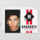 Célébrez l'exploit suprême d'un nouveau diplômé avec notre carte d'annonce de remise de diplôme pour homme moderne remarquable. Fièrement dotée de rayures sportives rouges vives et d'une touche personnelle avec l'initiale du diplômé gravée dans la casquette de diplômé. Au centre, une photo précieuse de votre érudit. Tous ces éléments se fondent harmonieusement, créant une annonce non seulement facile à personnaliser mais aussi impossible à ignorer.