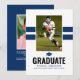Carte d'annonce de remise des diplômes pour garçon moderne avec 2 bandes sportives bleu marine, 2 photos du diplômé (une de chaque côté), une coiffe universitaire et un modèle de texte facile à personnaliser.