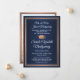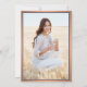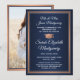 Partagez la joie d'une remise de diplôme de lycée ou d'université avec des faire-part personnalisés élégants de couleur bleu marine, cuivre et blanc. (CONSEIL DE PLACEMENT D'IMAGE : un moyen facile de centrer une image exactement comme vous le souhaitez est de la rogner avant de la télécharger sur le site Web de Zazzle.) Ce modèle de style formel comprend les noms des parents et du diplômé, ainsi que toute formulation de votre choix, comme les détails de l'invitation à la fête, les honneurs spéciaux, le titre du diplôme, la citation inspirante préférée, les coordonnées du diplômé, les futurs plans d'études ou le nouveau poste. Tout le texte est simple à personnaliser. Le design présente un fond ombré bleu moderne, une bordure de faux foil et une casquette de mortar board, une calligraphie élégante, une typographie traditionnelle et une photo de votre choix, comme une photo de fin d'études ou une image de la cérémonie de remise des diplômes. Veuillez noter que le cuivre est une couleur imprimée
