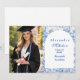 Un design de célébration de fin d'études élégant présentant une délicate bordure florale en toile de fond bleu inspirée de la porcelaine européenne classique et des impressions botaniques vintage. Les florales complexes encadrent un panneau central arqué et épuré, créant une composition raffinée et intemporelle qui met en valeur le nom du diplômé et les détails de l'événement de manière magnifique. Les tons bleus doux sur un fond ivoire net donnent au design une sensation sophistiquée et festive. Parfait pour une réunion de fin d'études élégante avec une esthétique classique et romantique.