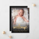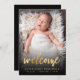 Faire-part de naissance moderne avec photo verticale personnalisée. Le mot "bienvenue" apparaît dans le faux script or. Ajoutez le nom du bébé, la date de naissance et les statistiques ci-dessous en police sans serif couleur or. Remplacez facilement l'exemple d'image par votre propre photo préférée de votre nouveau-né. Un écran de dégradé noir permet de s'assurer que le texte s'affiche. Le dos de la carte est noir.