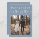 Aménagement moderne bleu poussiéreux ou faire-part mariage privée et accueil. Le devant présente votre photo de jour de mariage et "Happily Ever After Party" dans un mélange de typographie blanche simple et un script blanc chic avec des swashes. Ajoutez vos prénoms et votre date de mariage. À l'arrière, personnalisez votre faire-part mariage et votre invitation de réception, entrez votre adresse de site Web mariage pour créer un code QR que les invités peuvent scanner pour voir vos photos mariages, tous les détails et à RSVP en ligne, et ajoutez vos noms dans un script signature.
